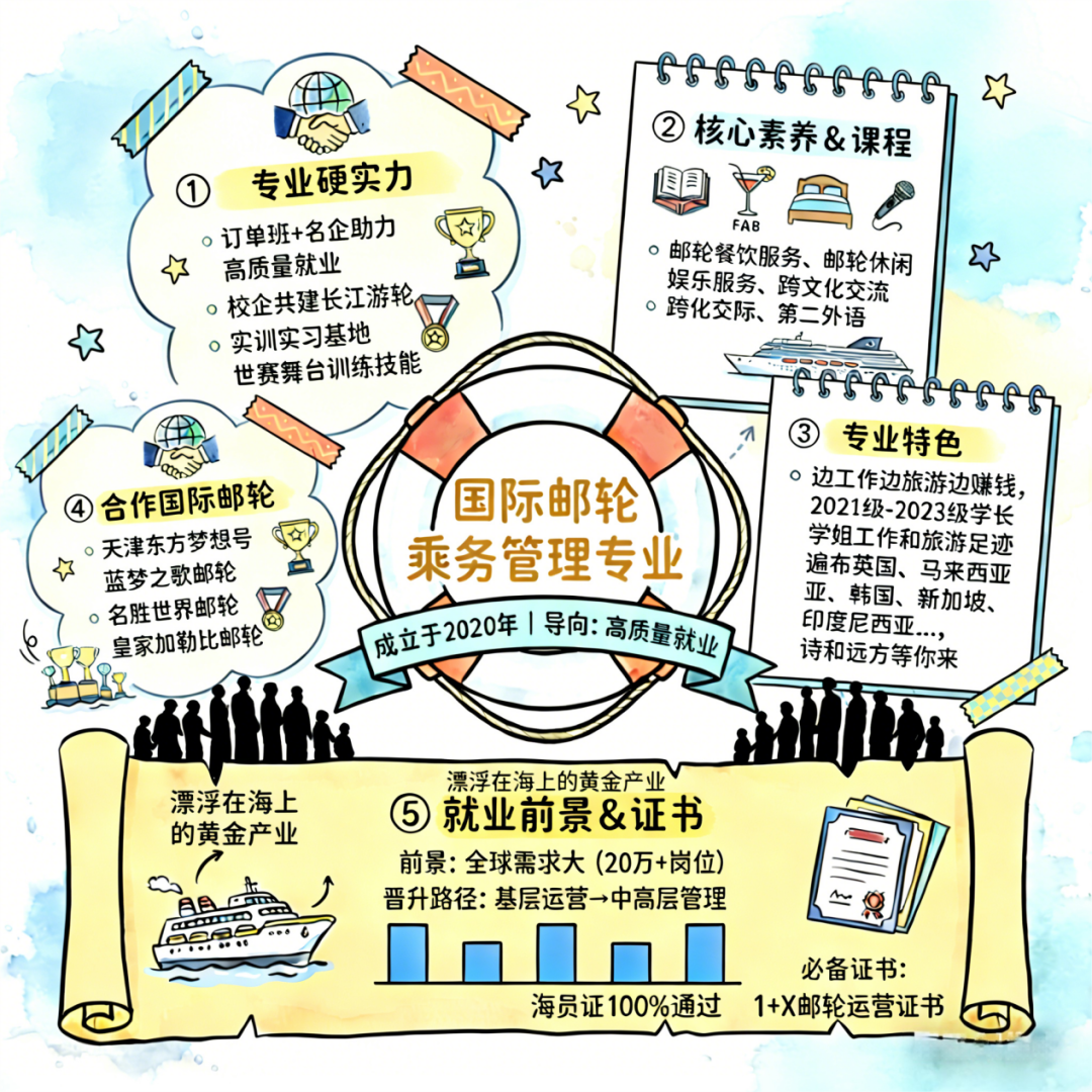 国际邮轮乘务管理专业自2020年成立以来,专业始终以“高质量就业”为导向,通过课程设置与岗位能力精准对接、校企资源深度融合,构建起国际邮轮高技能人才培养体系。