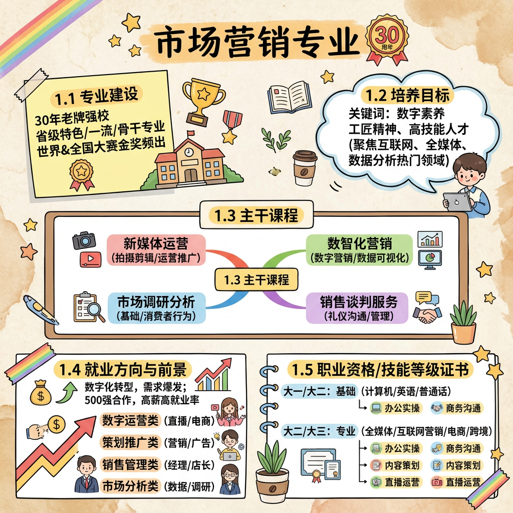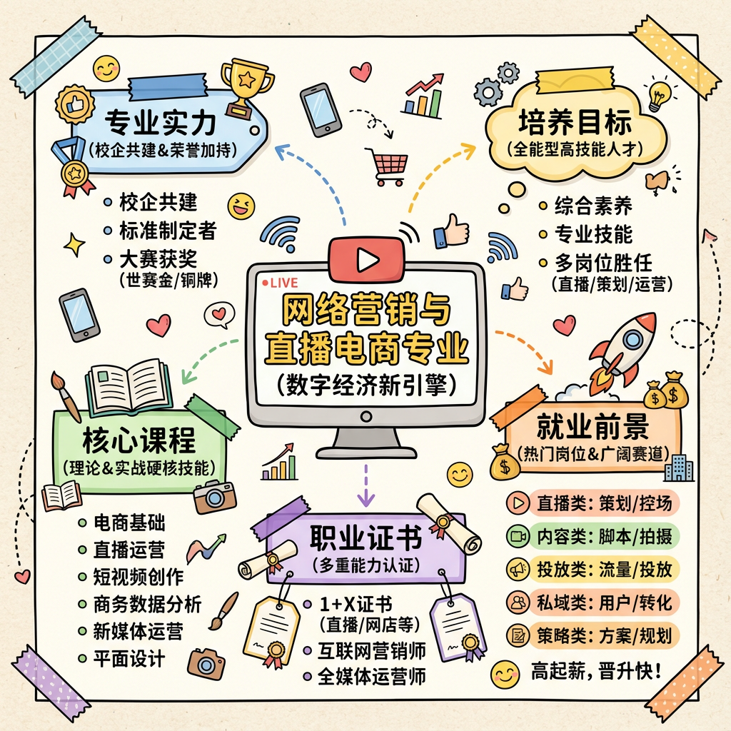 网络营销与直播电商专业紧跟数字经济发展趋势,以培养具备网络营销策划、直播电商全流程运营、短视频创作及数据分析能力的复合型高技能人才为目标,课程设置兼顾理论与实战,通过校企合作搭建实训工坊、引入真实运营项目、安排企业轮岗实习等方式强化学生实操能力,凭借“毕业即能上岗”的职业竞争力,可在电商平台、MCN机构、品牌企业从事直播运营、短视频策划、电商投手等热门岗位,就业前景广阔,能快速适配行业发展需求。