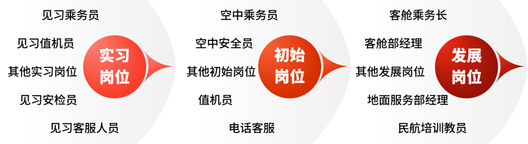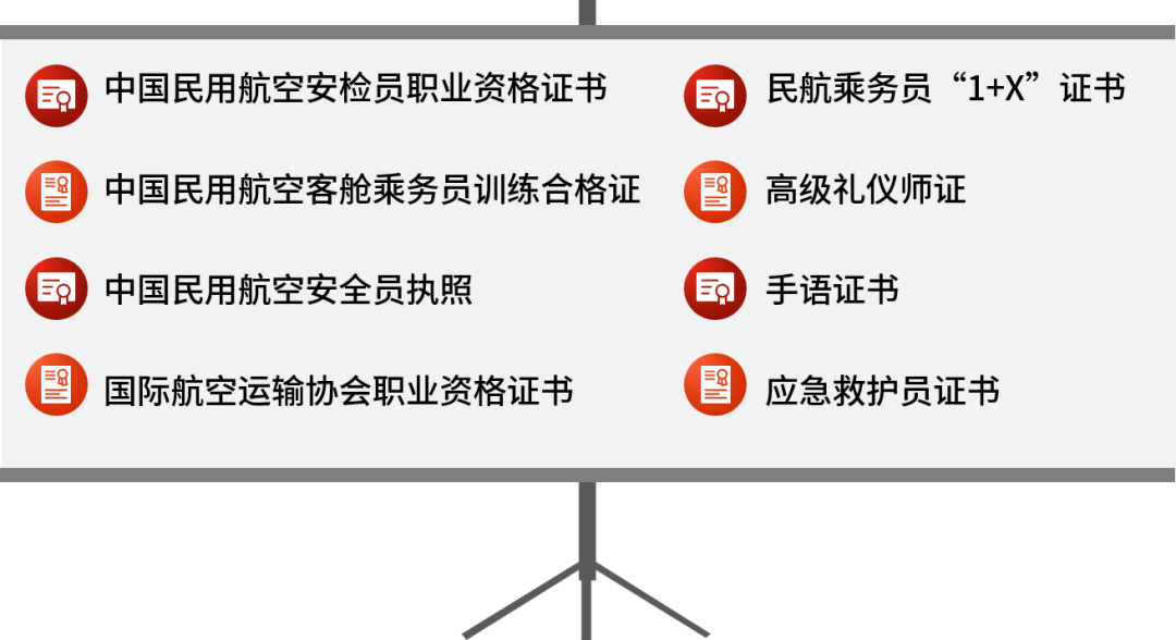 就业方向:国内外航空公司从事飞机客舱乘务员、航空安全员,地勤安检、值机票务、VIP贵宾接待、以及其他航空服务工作。