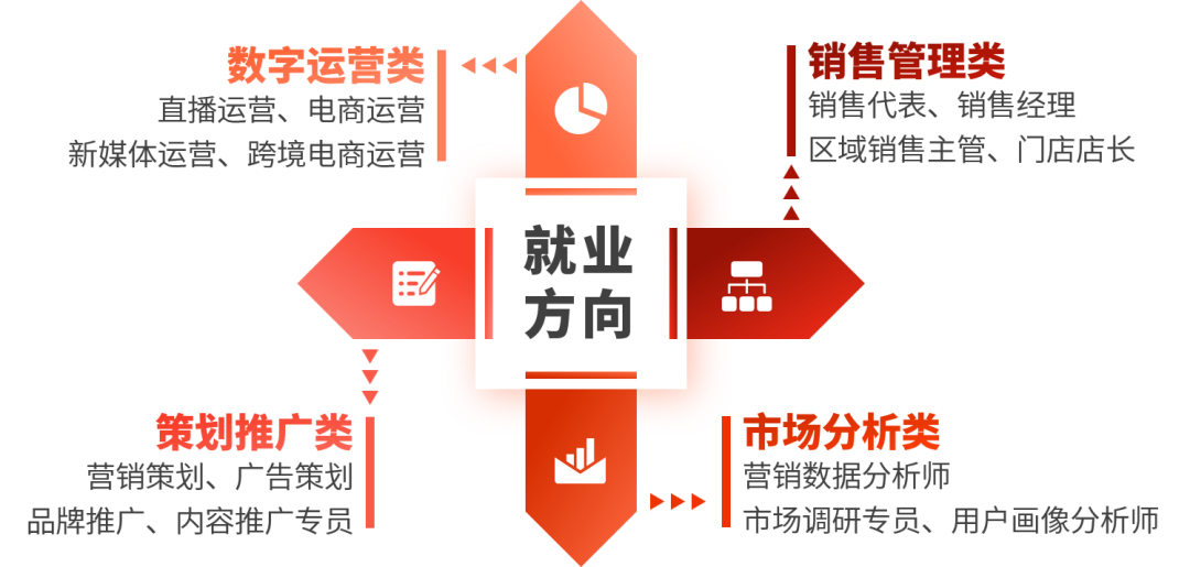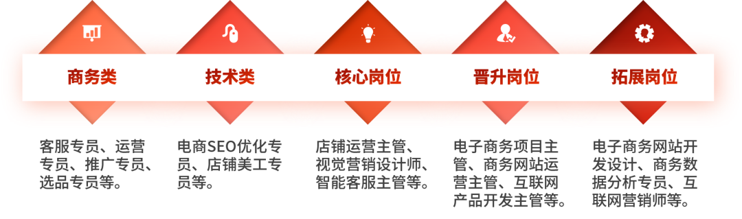 面向电子商务应用领域,可从事电商美工、店铺运营、网络推广、互联网思维文案创作、新媒体编辑与营销、网络客服与客户管理、移动商务、商务数据分析与应用、直播电商、跨境电商以及自主创业等工作。