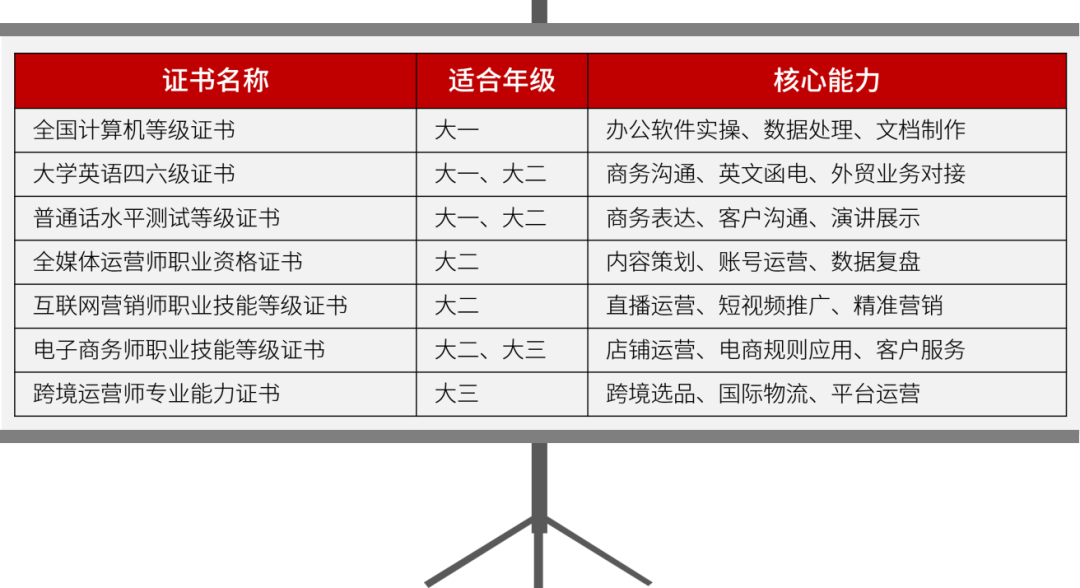 专业基础课:电子商务基础、零售基础、管理学基础、商务数据分析、数据可视化、电子商务法律法规等。