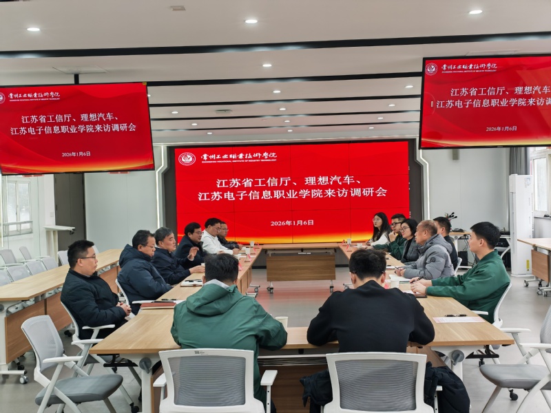 1月6日,江苏省工业和信息化厅装备二处副处长方松、理想汽车江苏政府事务总监陈畅、江苏电子信息职业学院汽车工程学院院长汪东明一行来我校调研交流。我校党委书记席海涛出席会议,会议由副校长檀祝平主持。