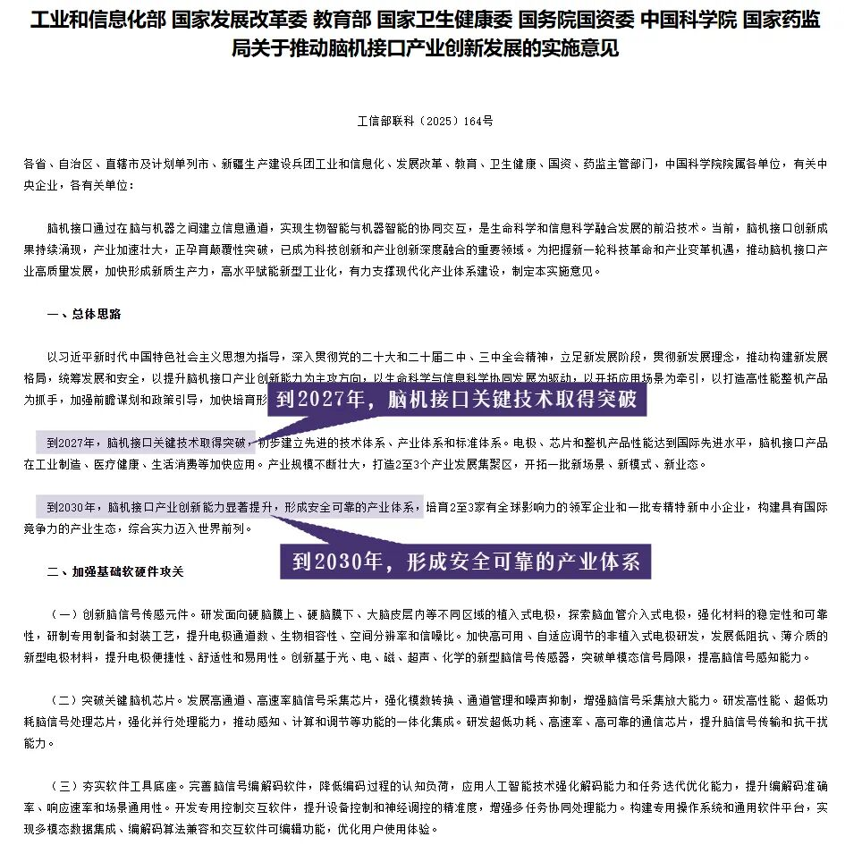 作为中国科技创新的前沿阵地,深圳在脑机接口领域展现出的强劲发展势头,也折射出这一产业的火热趋势。今年8月,中国工信部、发改委、卫健委等七部门就联合发布了《关于推动脑机接口产业创新发展的实施意见》,将该领域正式列为“未来产业”,并明确提出到2027年实现产业化落地、2030年形成全球化布局。