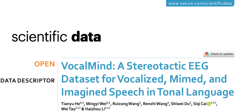 深圳大学附属华南医院神经外科杜世伟、陶蔚团队成功构建全球首个普通话的立体定向脑电图(sEEG)多模态语音数据集“VocalMind”,并实现从脑信号到语音波形的端到端重建,为声调语言脑机接口的临床应用奠定基础。