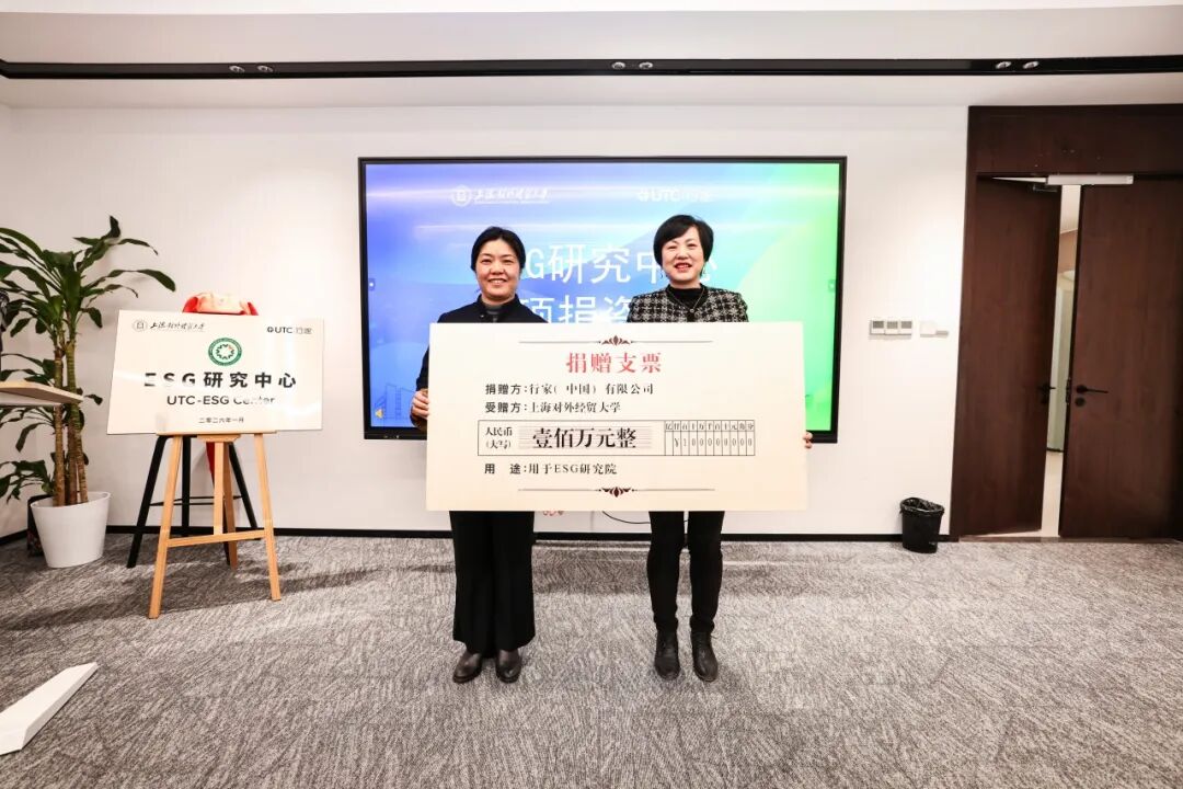 为保障中心工作的顺利推进,行家(中国)有限公司向学校捐助UTC-ESG研究中心专项资金100万元,孔卫红向上海对外经贸大学校友联络处处长晏琼递交专项基金捐赠支票,汪荣明校长颁发捐赠证书。