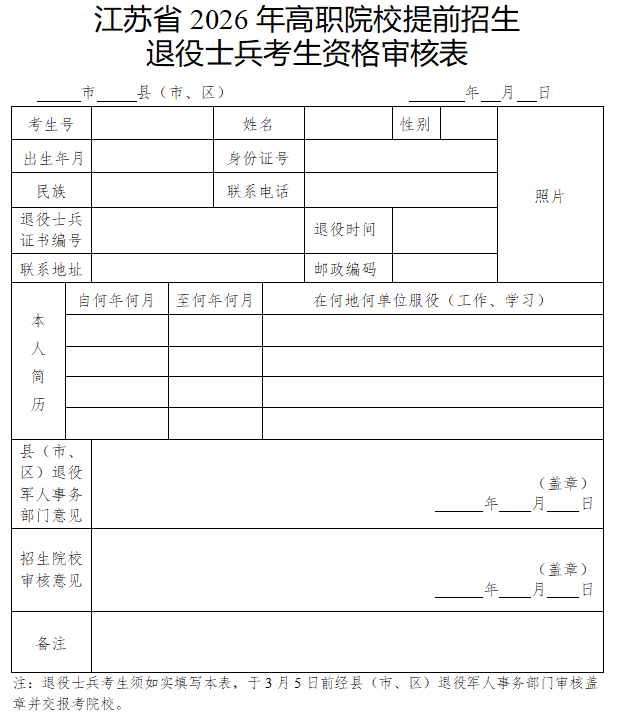 已参加2026年高考报名的退役士兵考生可填写《江苏省2026年高职院校提前招生退役士兵考生资格审核表》(见附件2),于2026年3月5日前经县(市、区)退役军人事务部门审核并交报考的学校,由省教育考试院汇总后会同省退役军人事务部门审核。退役士兵考生须按上述规定的时间和流程向学校提出报考申请,其学业水平合格性考试要求不作统一规定,录取要求由相关学校自主确定。
