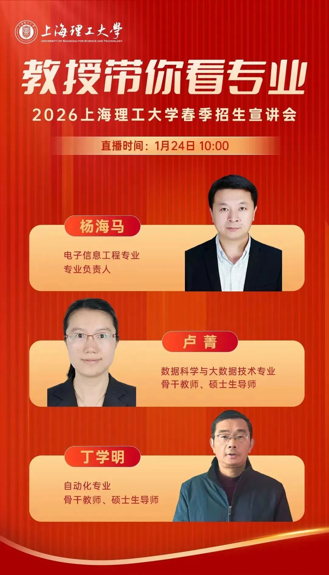 为了帮助考生更深入地了解上海理工大学各春招专业,学校特此开展了主题为“教授带你看专业”的春季招生宣讲会活动,邀请专业教师以在线直播的方式进行全面解读。