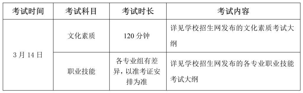 4.D类考生免予文化素质测试。职业技能测试由学校组织,采取笔试或技能展示方式进行,重点考察学生的职业适应性和职业技能,满分300分。