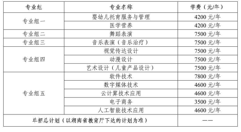 第十四条 学校2026年单招总计划数以湖南省教育厅下达的最终计划为准,其中包含单列计划的C类招生计划12人,D类招生计划5人。下表招生专业等信息仅供参考,具体专业组、组内专业及招生计划以省教育考试院网上填报志愿系统数据为准。各专业最终学费标准以2026年湖南省物价主管部门审核为准。所有专业均不限考生类别,即物理类、历史类、职高对口类考生均可报考。