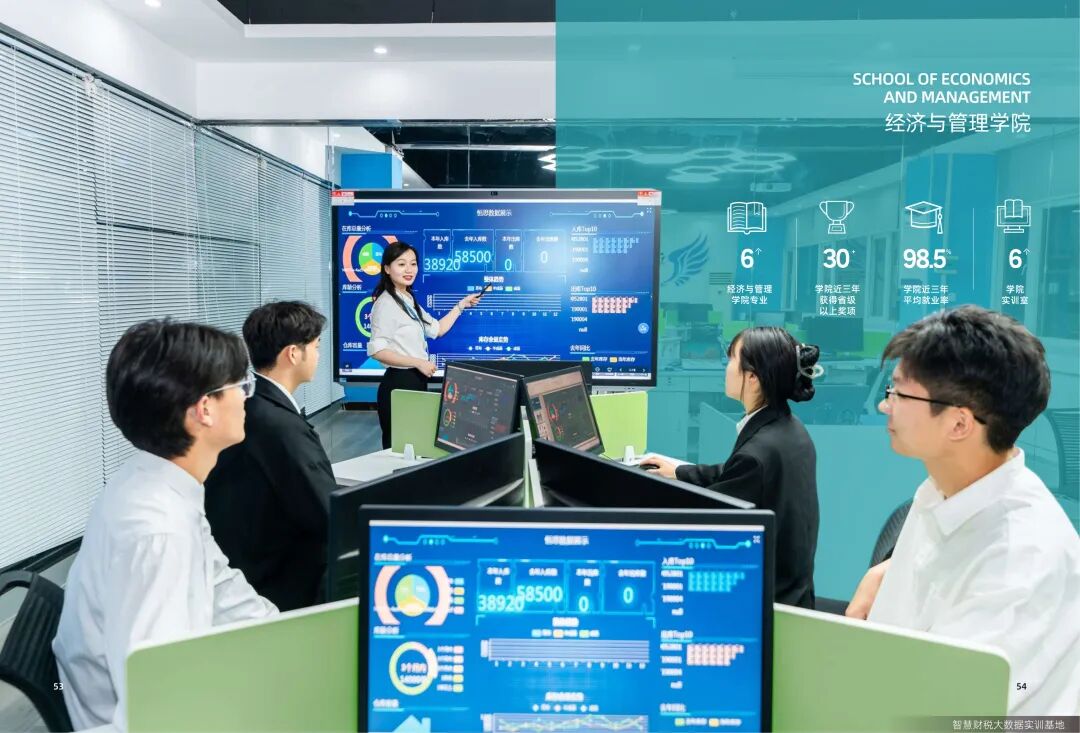经济与管理学院是学校重点建设的商科学院,在校生3000余人。学院是全国现代服务业职业教育集团副理事长单位,获批中国标准化协会服务贸易分会会员单位,并成为首批服务贸易标准化"进校园、进设堂、进书本"试点院校。拥有财务大数据可视化实验室、财税一体化实训室和共享服务中心、客房实训室等6间实训室,满足各专业发展需要。历届毕业生活跃在制造业、旅游业、商贸服务业等多个行业,近三年平均就业率达98.55%。学院坚持以赛促教,近三年获得省级以上奖项30余项。