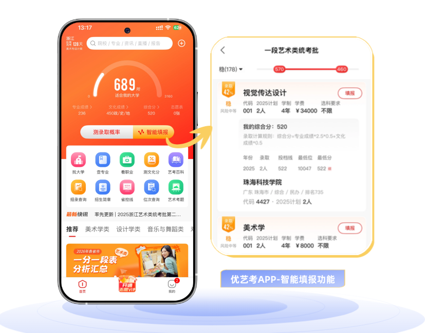 当然,大家也可以在优艺考app内输入自己的首考成绩及平常的模考成绩,即可查看自己的整体分数处于什么水平,也能看到自己的分数能报考哪些大学,提前了解自己的竞争力如何。