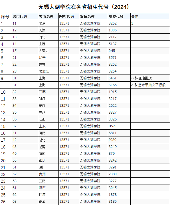 无锡太湖学院在各省招生代号(2024)
