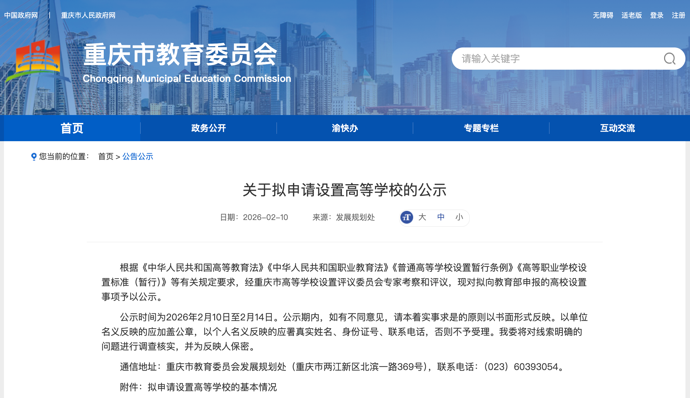 根据《中华人民共和国高等教育法》《中华人民共和国职业教育法》《普通高等学校设置暂行条例》《高等职业学校设置标准(暂行)》等有关规定要求,经重庆市高等学校设置评议委员会专家考察和评议,现对拟向教育部申报的高校设置事项予以公示。公示时间为2026年2月10日至2月14日。