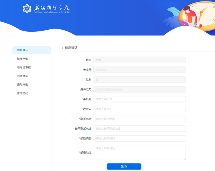考生按照要求登录“服务系统”后,第一步是出现“信息确认”菜单页面内容,如下图所示,将自己的相关信息填写完整并保存后,方可进入“缴费查询”菜单,进行缴费情况查询。