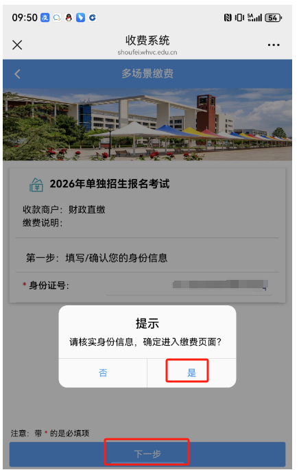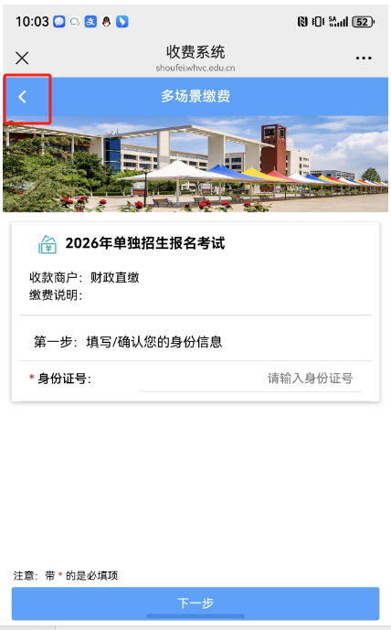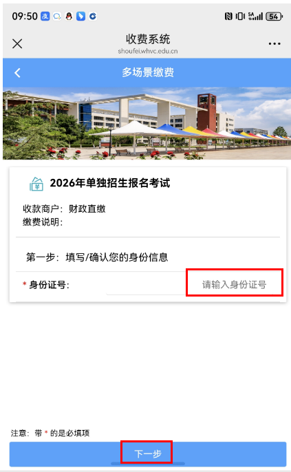 二、进入“威海职业学院收费系统2026年单独招生报名考试”界面,在“身份证号”一栏输入考生居民身份证号码后,点击“下一步”。