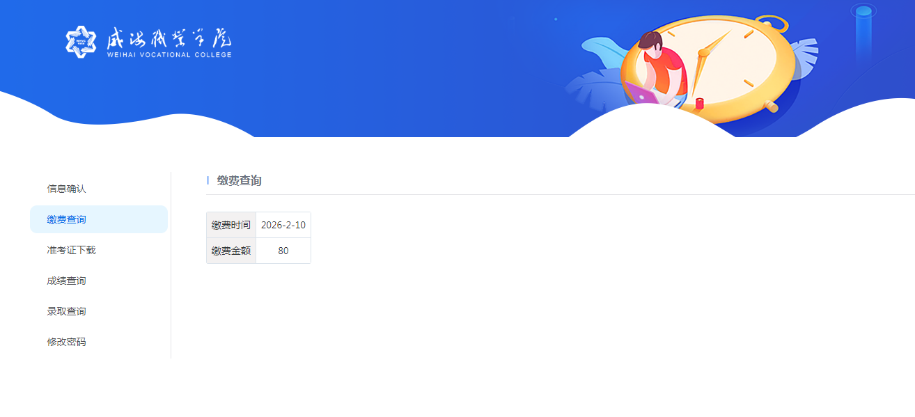 六、缴费完成后,请考生登录“威海职业学院高职单招考生服务系统(http://zhaosheng.whvc.edu.cn/casdz)”,进行缴费结果查询。已缴费的考生可于缴费第二天(示例:3月1日缴费成功的考生,可于3月2日查询,最好间隔24小时后),登录“考生服务系统”,查看自己的缴费情况。