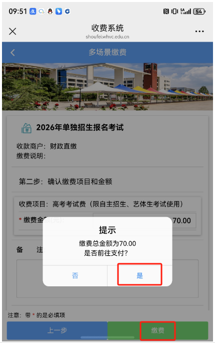 三、核实身份信息无误后,点击“是”,进入缴费页面。