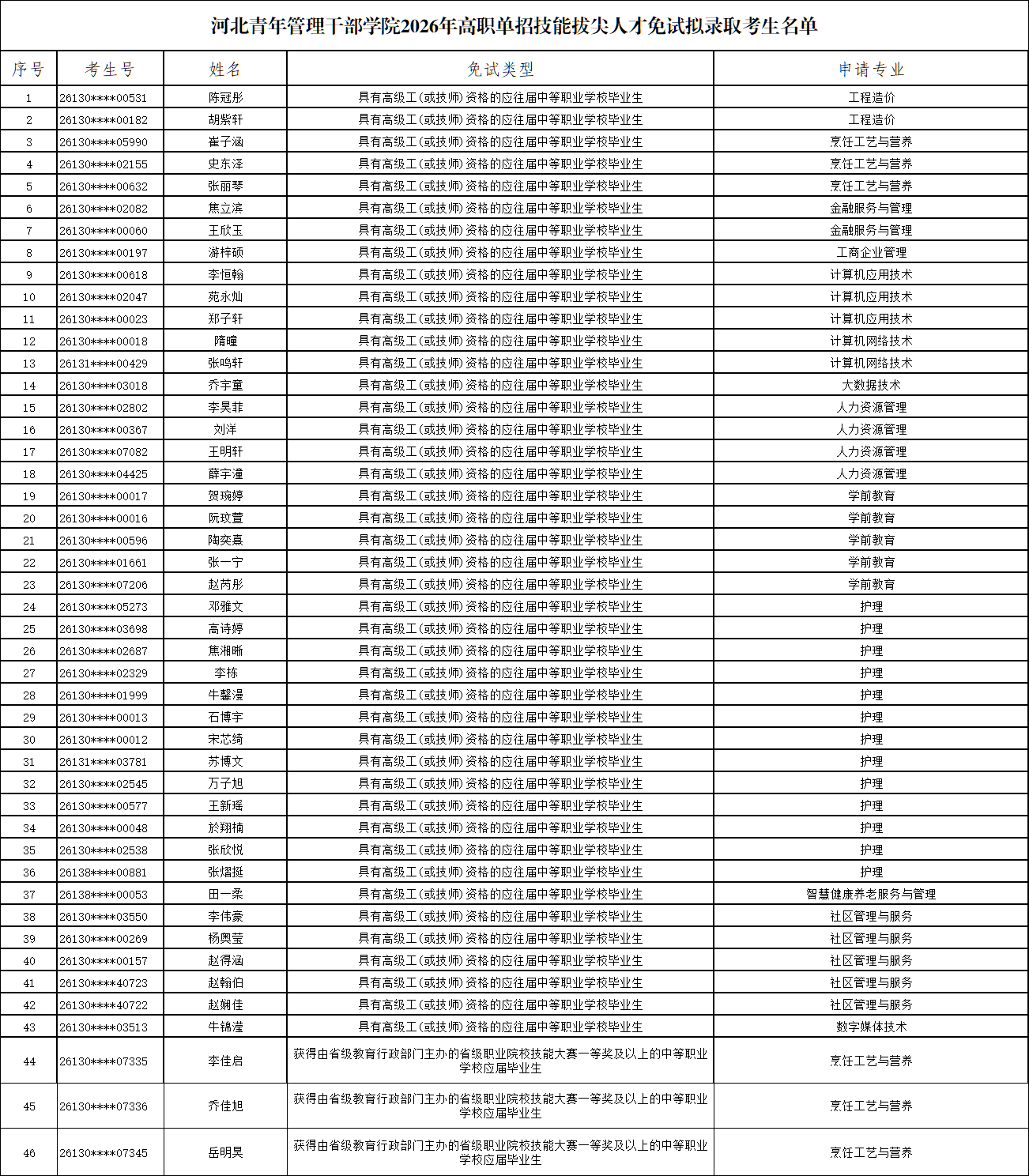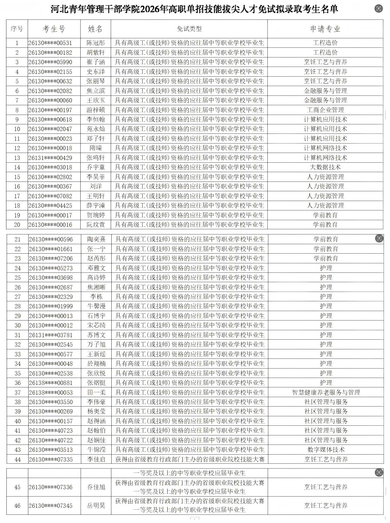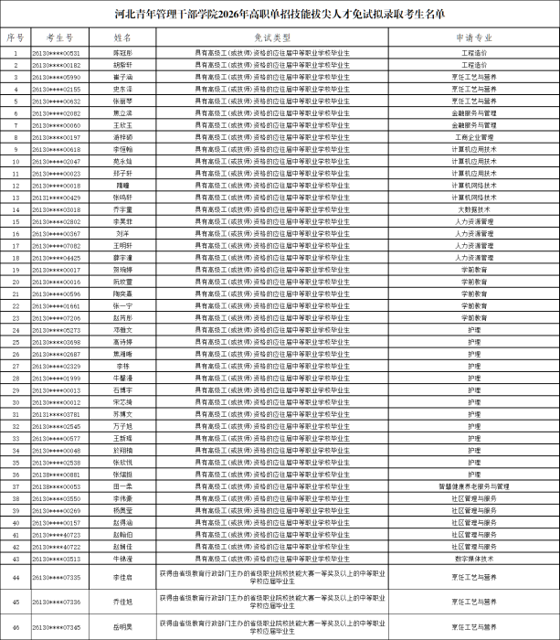 根据河北省教育厅《关于做好2026年普通高等职业教育单独考试招生工作的通知》(冀教学〔2025〕6号)及河北省教育考试院印发的《2026年河北省普通高等职业教育单独考试招生工作实施办法》相关规定,现将申报我院2026年高职单招技能拔尖人才免试入学拟录取考生名单予以公示。