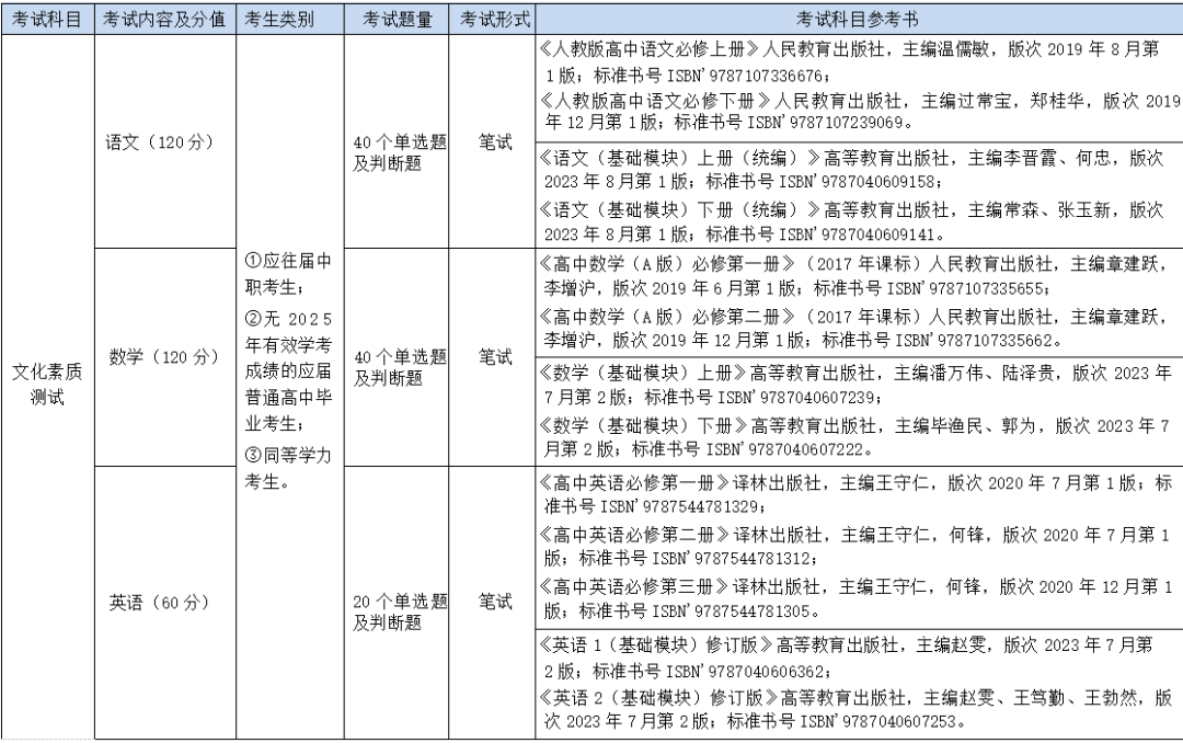 考试科目:文化素质测试(300分)、职业技能测试(300分)。