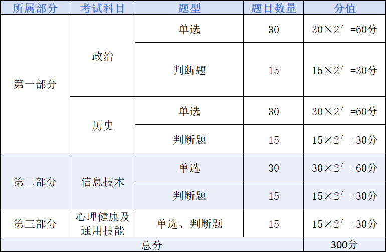 考生的综合成绩为文化素质成绩+职业技能成绩。上述A类、B类、C类考生的高职单招综合成绩(总成绩)满分为600分,其中文化素质成绩与职业技能成绩占比为1:1,即各占300分;D类考生的综合成绩满分为300分。