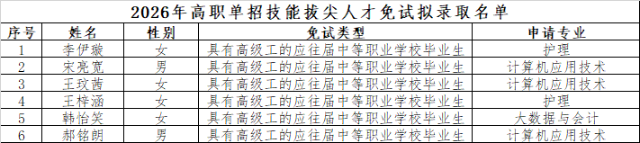 根据河北省教育厅《关于做好2026年普通高等职业教育单独考试招生工作的通知》(冀教学〔2025〕6号)及河北省教育考试院《2026年河北省普通高等职业教育单独考试招生工作实施办法》相关规定,现将申请我校2026年高职单招技能拔尖人才免试入学拟录取考生名单予以公示,公示日期为2026年3月1日—2026年3月4日,接受社会监督。如有异议请在公示期间反映,对不符合报考条件的考生将取消免试录取资格。公示期满后,如无异议,按要求上报河北省教育考试院备案。