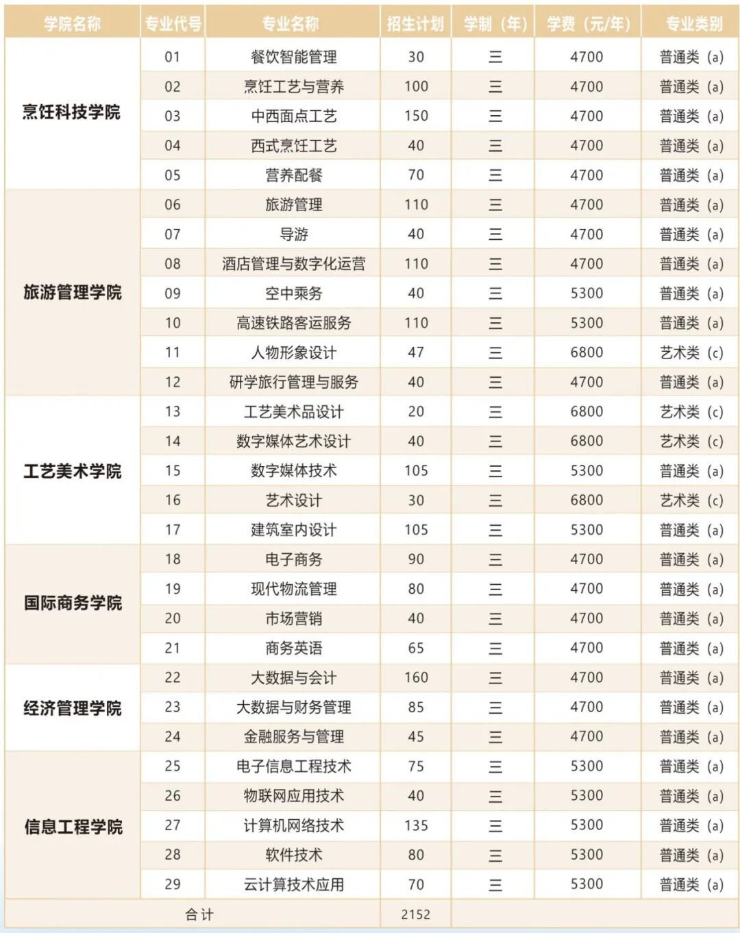 学院现有专兼职教师700余人,在校学生13000余人,有内设机构31个,包含烹饪科技学院、旅游管理学院、工艺美术学院、国际商务学院、经济管理学院、信息工程学院、马克思主义学院、体育部、基础部等9个二级院(部)。开设了烹饪工艺与营养、旅游管理、酒店管理与数字化运营等33个三年制高职专业,5个“3+2”高职与本科分段培养项目,现有省级高水平专业群3个。