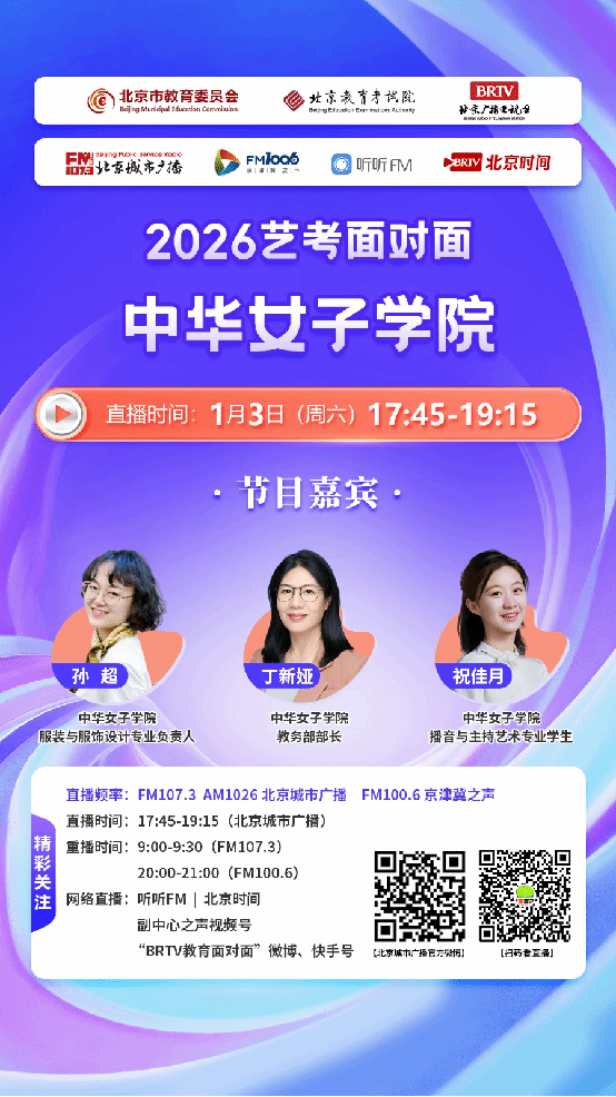 1月3日(周六)17:45-19:15,将开展“2026艺考面对面・中华女子学院”专场直播。中华女子学院教务部部长丁新娅、服装与服饰设计专业负责人孙超、播音与主持艺术专业学生祝佳月,将与大家面对面分享艺考相关内容,敬请关注!