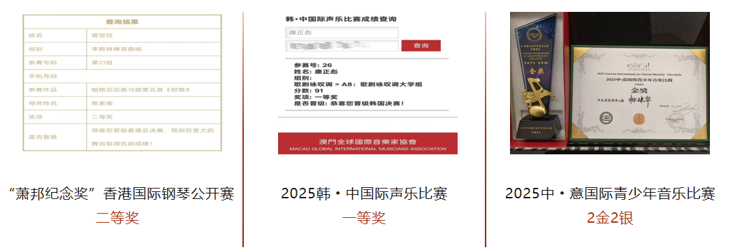 国际赛事高光2025韩·中国际声乐比赛一等奖、2025中·意国际青少年音乐比赛2金2银、“萧邦纪念奖”香港国际钢琴公开赛二等奖(学生蒋世纹晋级香港总决赛)。