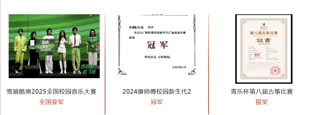 全国赛事突围雪碧酷爽2025全国校园音乐大赛个人全省总冠军、2024康师傅校园新生代2冠军、青乐杯第八届古筝比赛银奖。