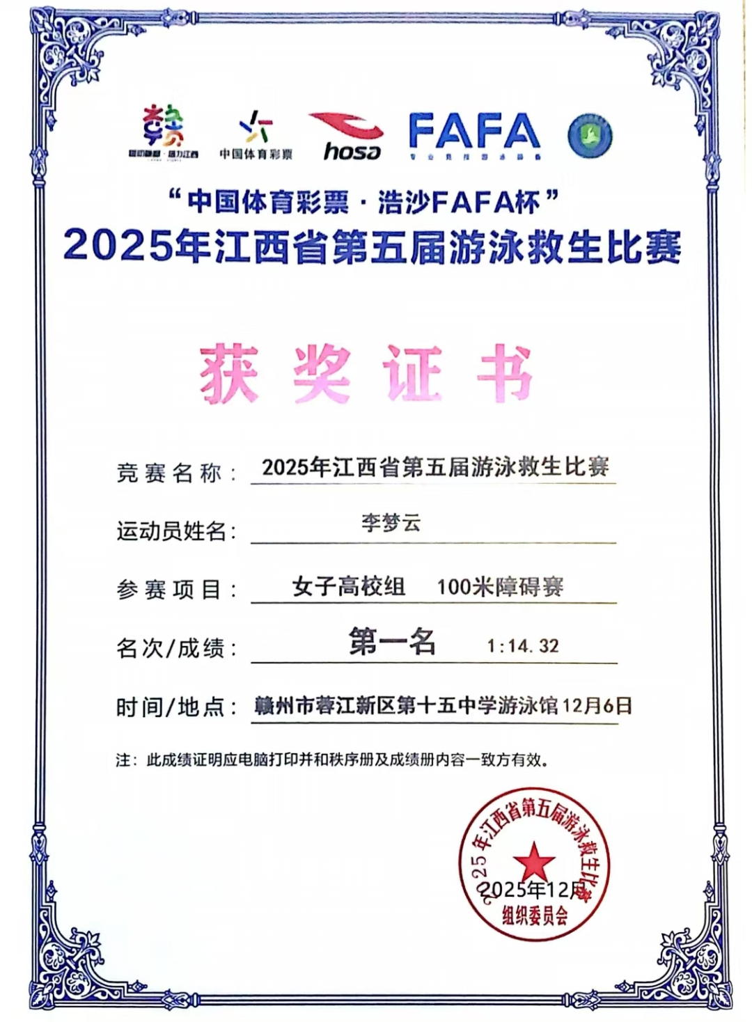 2025年江西省第五届游泳救生比赛一等奖