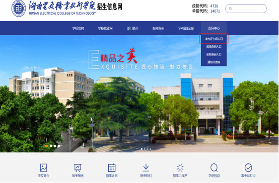 第一步:打开电脑,在推荐使用的浏览器(谷歌、火狐、360浏览器极速模式等其他浏览器极速模式)中打开湖南电气职业技术学院招生信息网(网址:http://hndqzyjsxy.zs.bysjy.com.cn/),点击【查询中心】—【准考证打印入口】,或者直接在浏览器中输入http://ks.qdexam.com:6765/