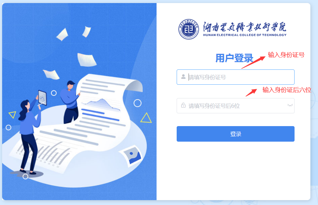 第二步:在登录页面上第一个输入框输入账号:身份证号码,第二个框中输入密码:身份证后六位