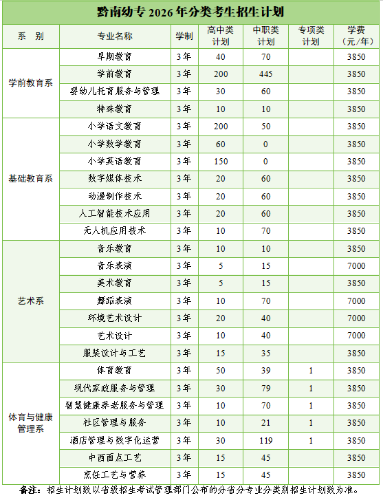 黔南幼专2026年分类考生招生计划