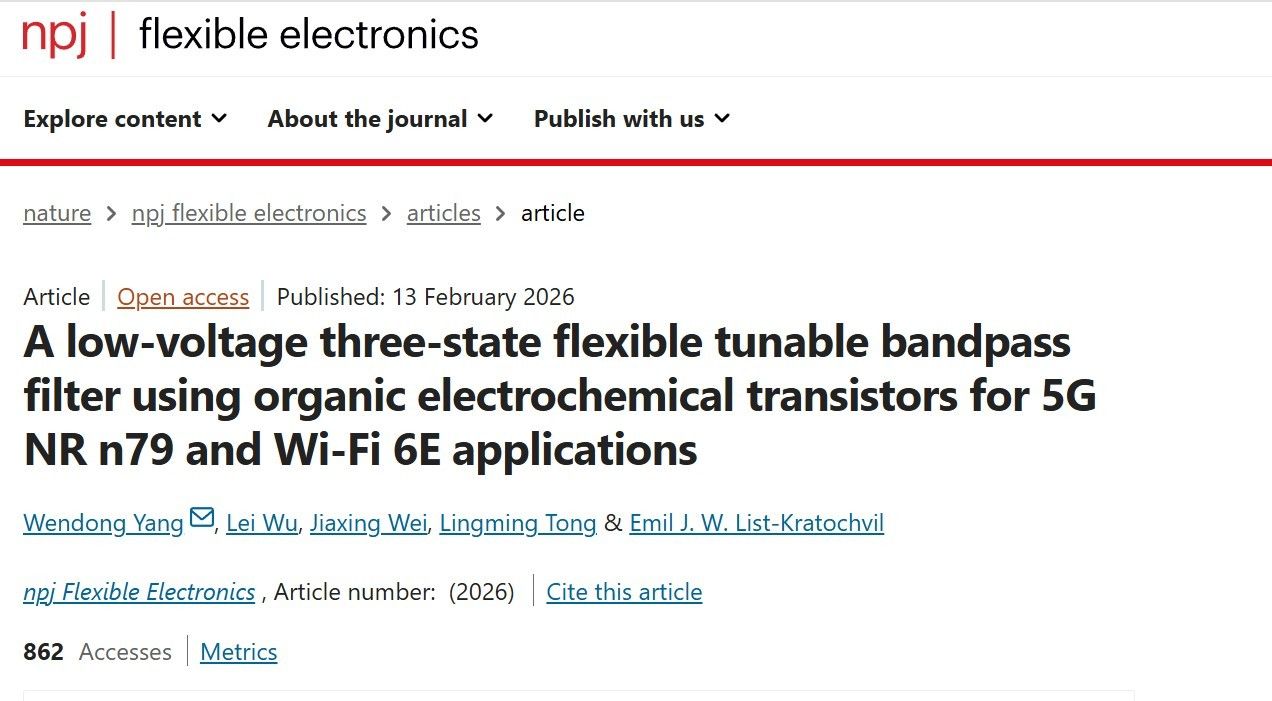 论文信息:Yang, W., Wu, L., Wei, J. et al. A low-voltage three-state flexible tunable bandpass filter using organic electrochemical transistors for 5G NR n79 and Wi-Fi 6E applications. npj Flex Electron (2026). https://doi.org/10.1038/s41528-026-00548-2