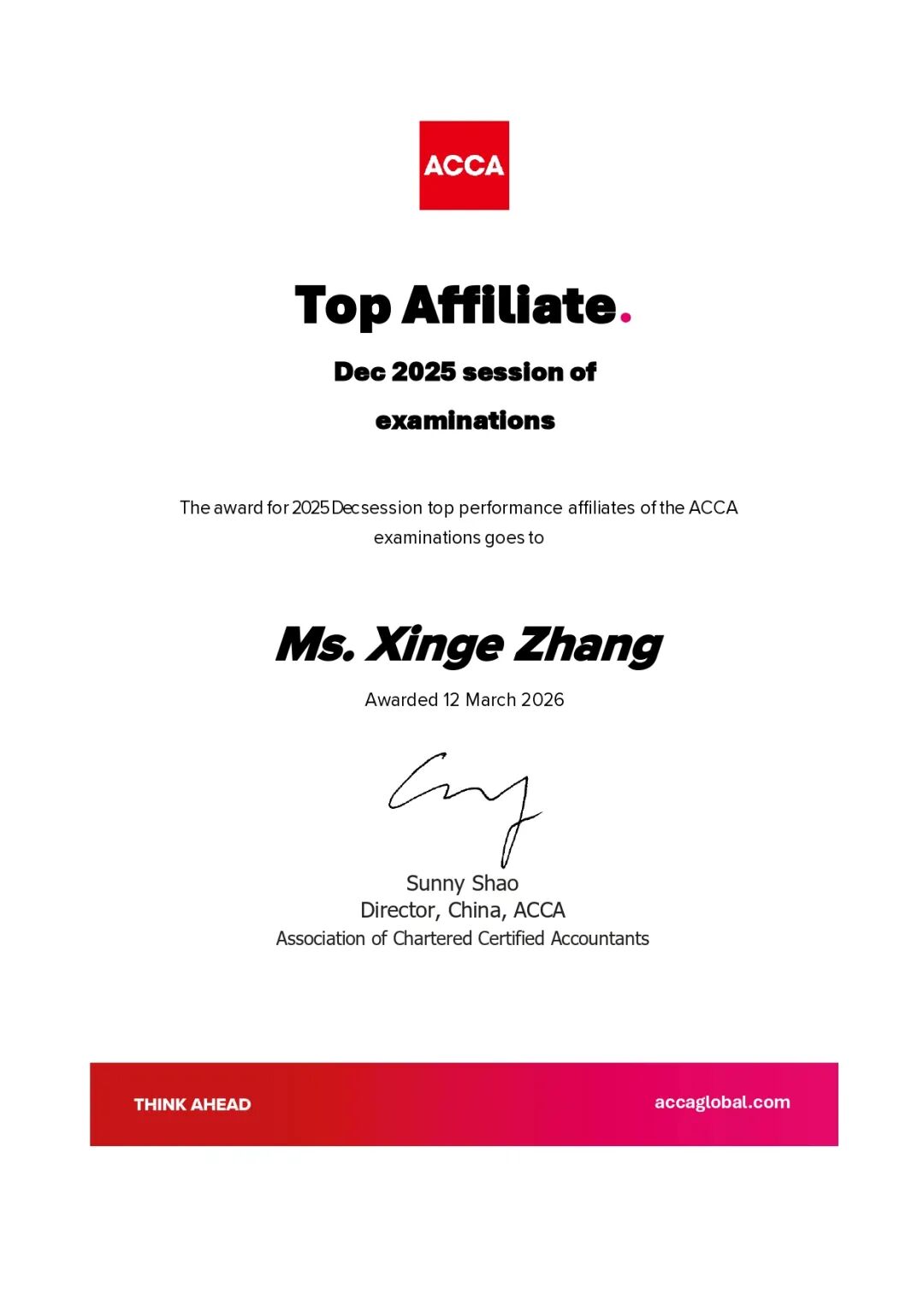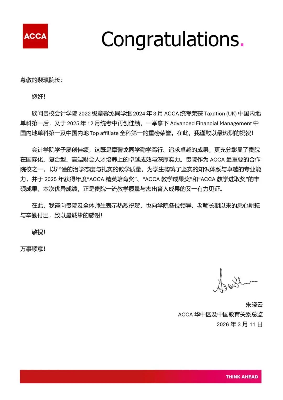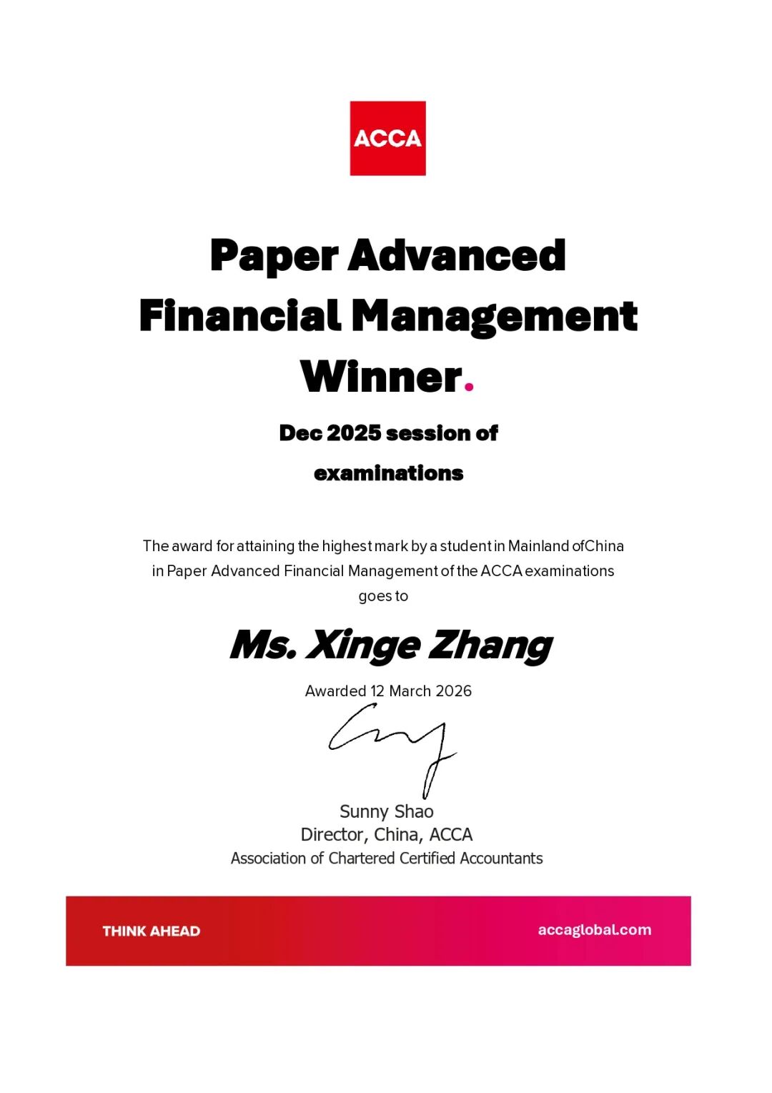 近日,从ACCA中国获悉,我校会计学院2022级本科生章馨戈,继ACCA统考荣获Taxation(UK)中国内地单科第一后,又一举拿下Advanced Financial Management中国内地单科第一及中国内地Top affiliate全科第一的重磅荣誉。