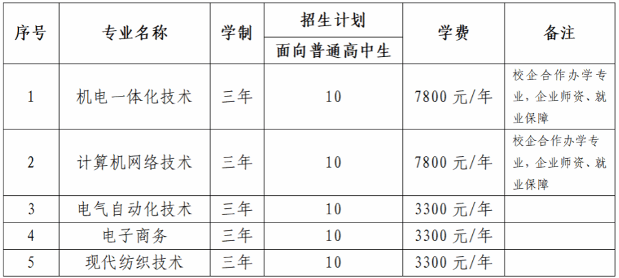 学校共设置招生专业5个,招生计划50名,招收普通高中毕业生,具体招生专业及计划如下: