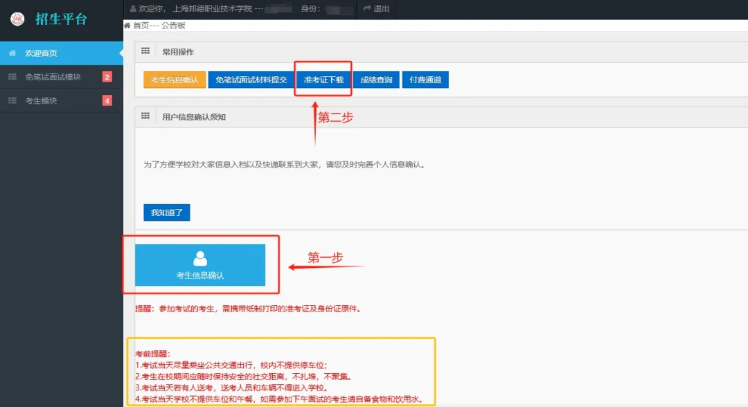 认真阅读“考前提醒”,点击“准考证下载”,打印“纸制准考证”。按考生须知准备好考试相应物品。