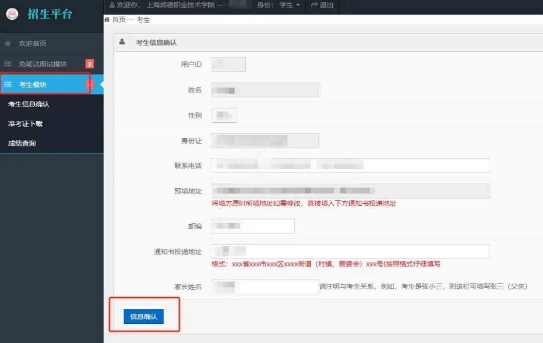点击“考生信息确认”,按要求填写考生的完整信息,检查无误后,点击“信息确认”。