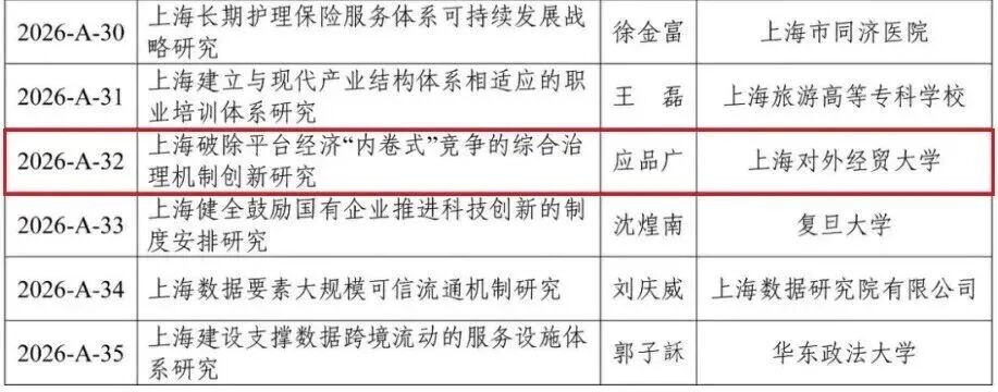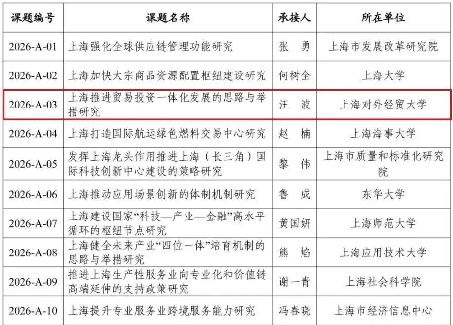 2026年度上海市人民政府决策咨询研究重大课题于2月2日至3月4日面向社会公开申报,期间收到有效申请共630份。经组织专家线上匿名评审和线下面谈比选,确定35个研究团队获得承接资格。我校国际经贸学院汪波副教授和国际组织学院(贸易谈判学院)应品广教授两位老师喜获立项。