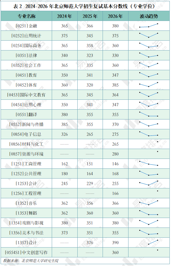 北师大专业学位分数线呈现出比学术学位更为剧烈的深V反弹与结构性分化,2026年普遍迎来强力回升,金融专业分数三年持续走高。体育、