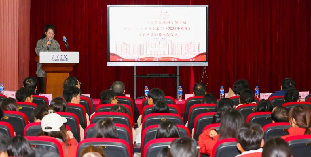 2026年3月9日,滇池学院体育美育浸润行动计划第三期驻大关县“真也超燃筑梦”支教团出征仪式在海埂校区举行,滇池学院校长甘雪春,党委书记陈炳灿,副书记、副校长向晓明,副校长高力出席仪式,体育学院院长白雪松,艺术学院院长倪红春,学生处副处长李敏、秦滢、张晋铭,校团委书记王怀磊,体育学院、艺术学院、党委宣传部等相关部门人员及43名支教团师生参加活动。出征仪式由学生处李敏主持。