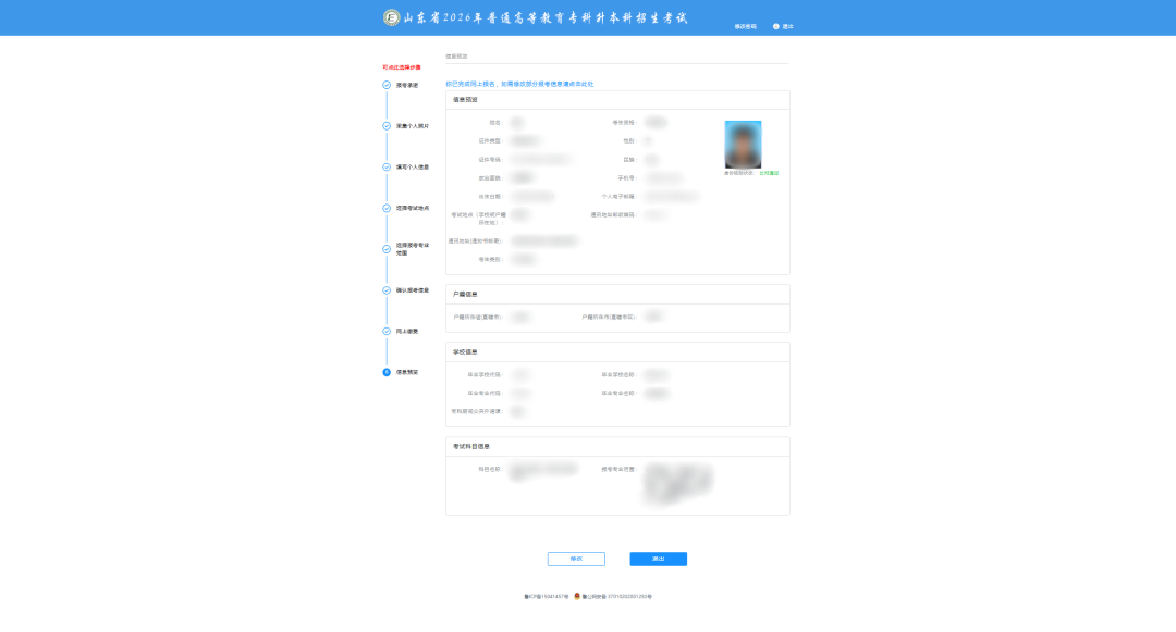 考生缴费成功后进入“信息预览”界面,可预览个人信息、户籍信息、学校信息和考试科目信息,如下图所示: