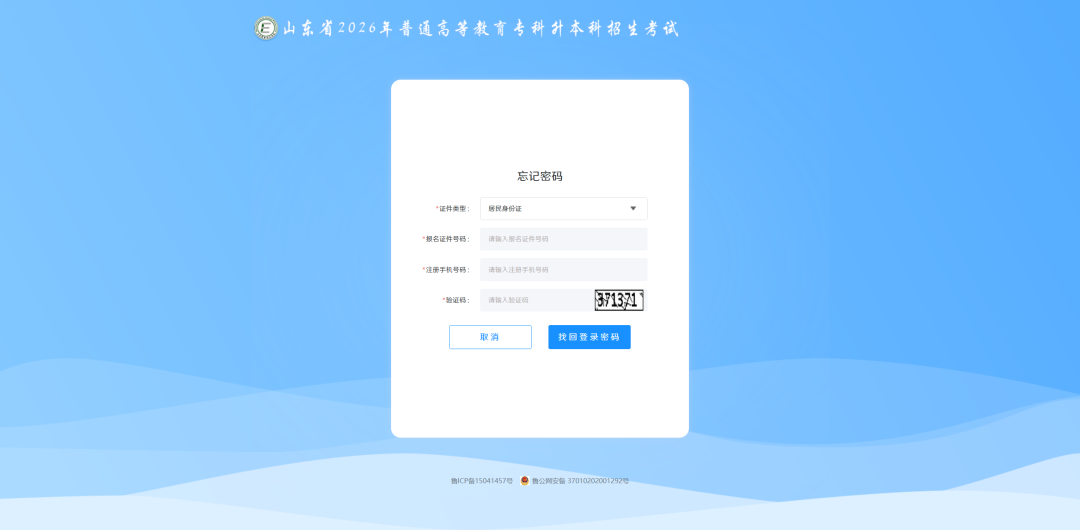 若考生已注册且忘记登录密码,可点击登录界面的【忘记密码?】按钮进入密码找回界面,选择证件类型,输入证件号码、注册手机号码和验证码,点击【找回登录密码】按钮,考生注册手机号会接收到一个10位的新密码,如下图所示: