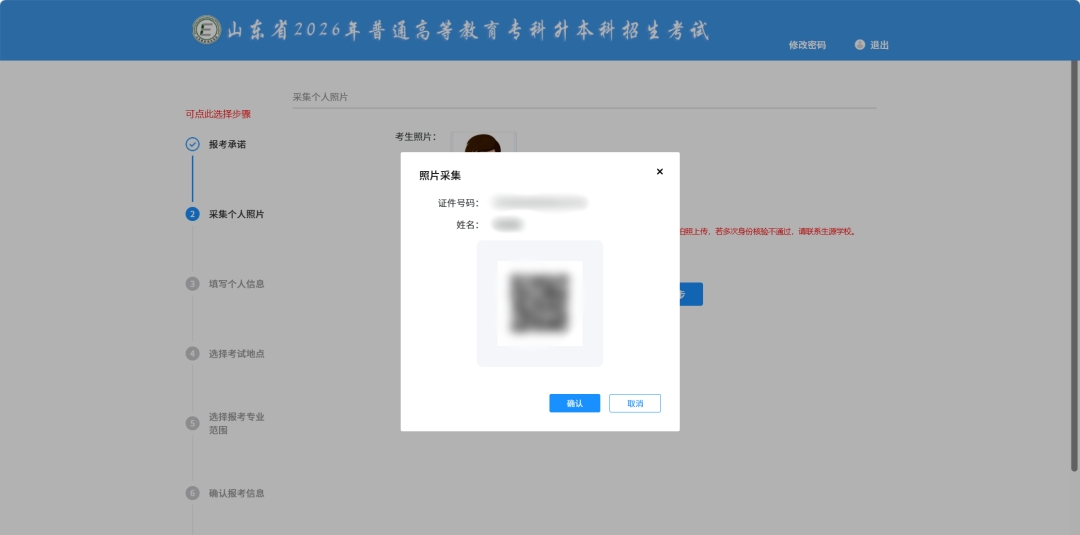 点击【采集照片】按钮,通过手机扫码后,拍摄采集提交本人照片进行上传确认,如下图所示: