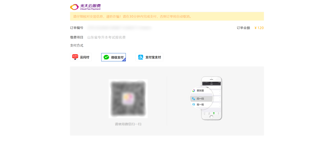 考生确认报考信息后进入“网上缴费”界面,核对缴费信息,确认无误后可点击【缴费】按钮进行缴费。其中青岛考生支持银联支付,其他地市考生采用光大支付。如下图所示:
