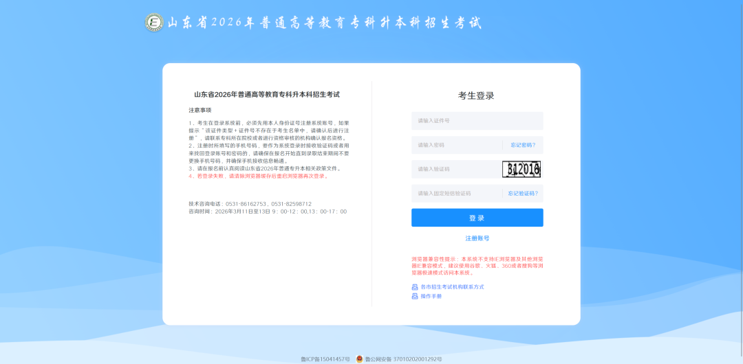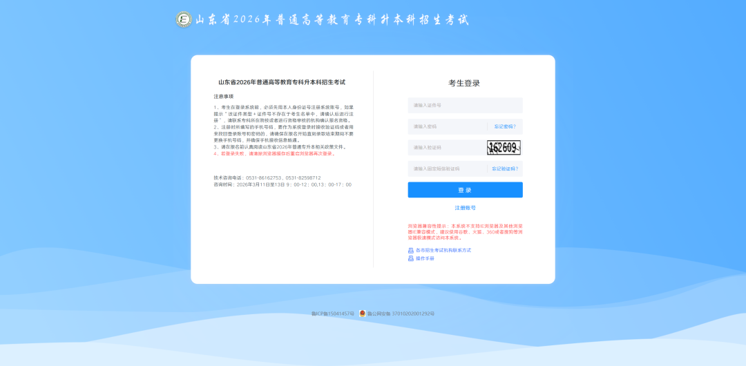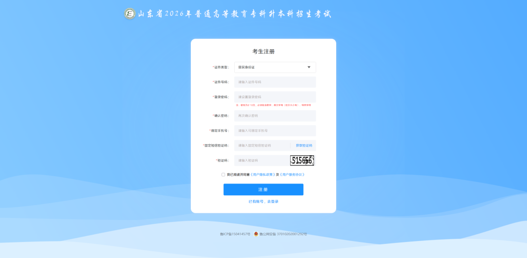 考生注册成功后进入登录界面,正确输入证件号、密码、图片验证码、短信固定验证码,点击【登录】按钮即可登录系统,如下图所示:
