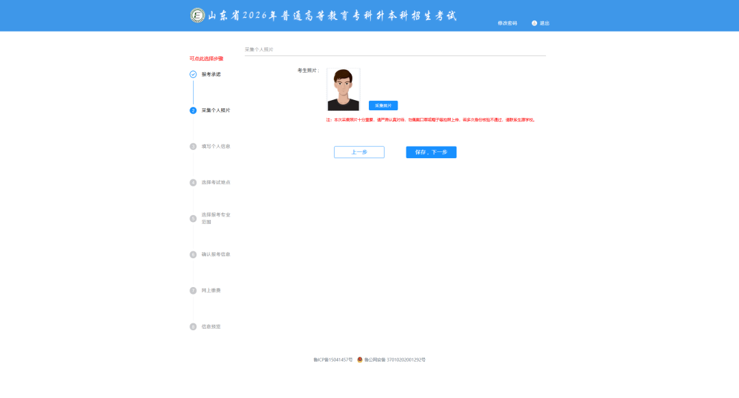 照片上传完成后,点击采集照片弹窗界面的【确认】按钮,照片确认完成后页面显示所上传的照片,点击【保存,下一步】即可进入填写个人信息界面,如下图所示: