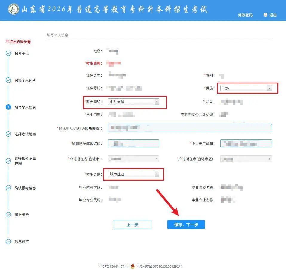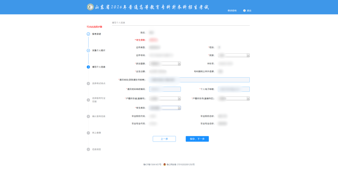 个人信息修改:点击【修改】按钮,考生返回“填写个人信息”页面,只能修改本考生的民族、政治面貌、考生类别信息,修改后点击【保存,下一步】按钮,方可保存成功,如下图所示: