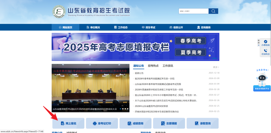 考生在浏览器地址栏中输入https://zsb.sdzk.cn/进入报名系统,或者进入“山东省教育招生考试院”官网,点击【网上报名】,如下图所示: