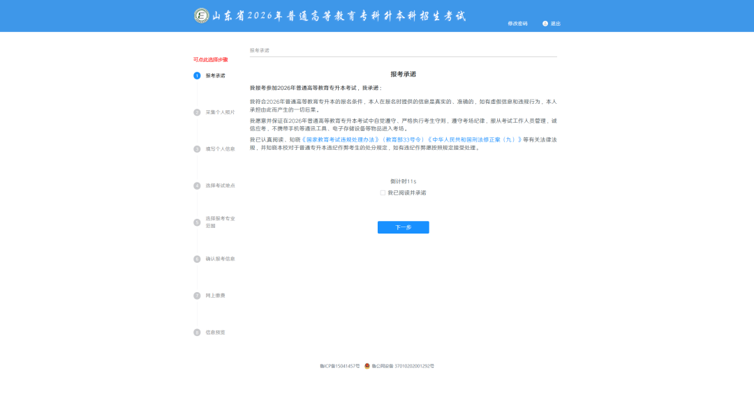 考生成功登录系统,进入报考承诺页面,认真阅读并勾选【我已阅读并承诺】(倒计时结束后),点击【下一步】,进入采集个人照片界面,如下图所示: